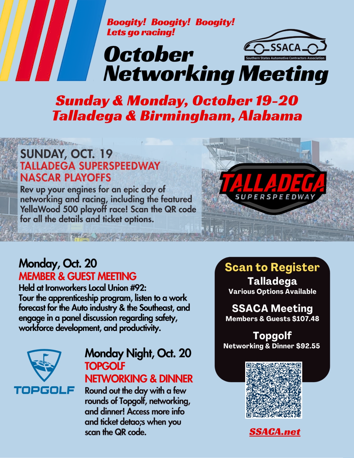 Join us at the SSACA October Networking Meeting, Sunday and Monday, October 19 and 20, at Talladega and Birmingham, Alabama! Sunday features a day at Talladega. The member and guest meeting takes place on Monday, followed by a visit to Topgolf for some swings, networking, and dinner. See the full details below. Register Here.